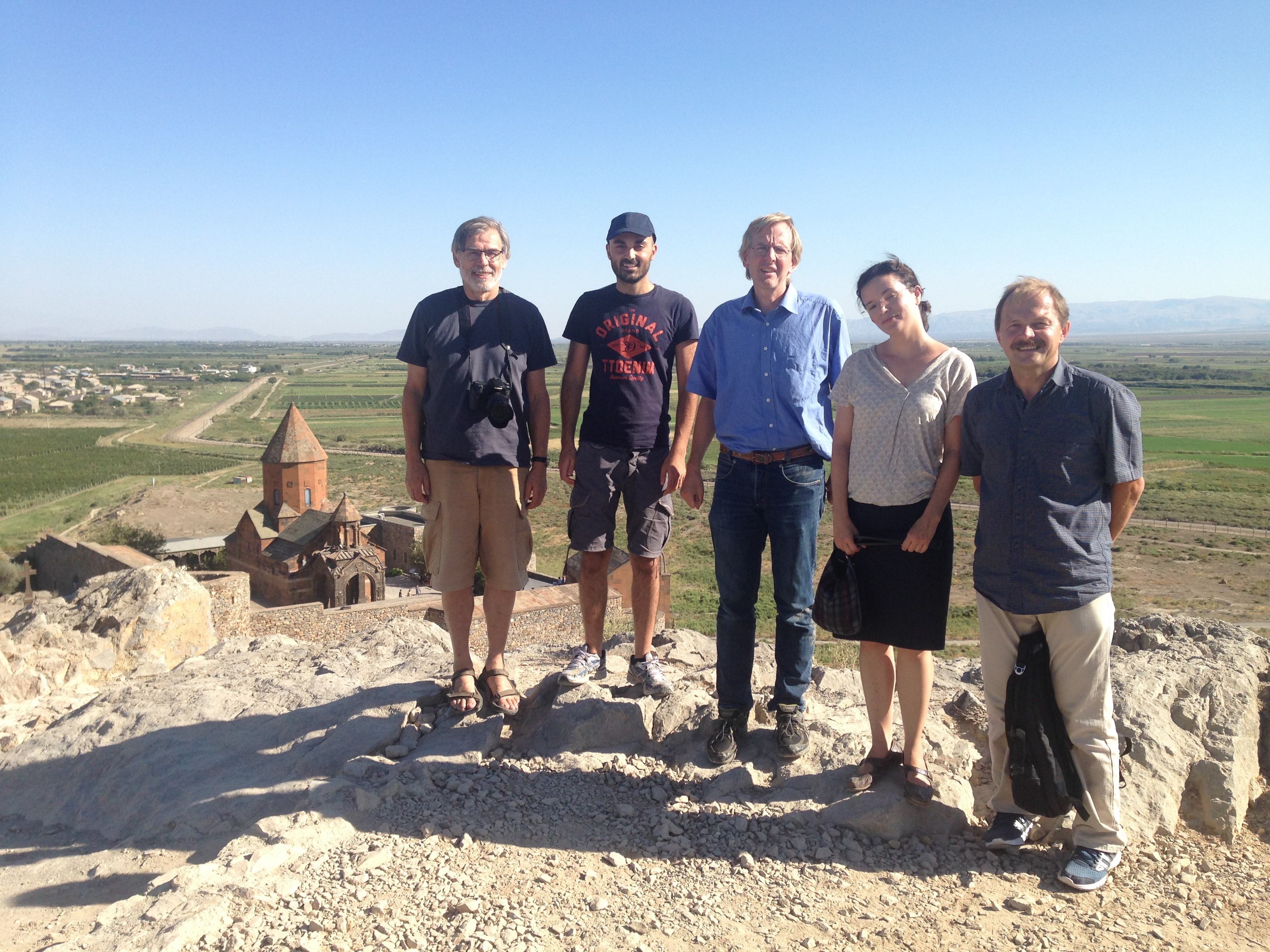 Roman Kotecký, Lorenzo Taggi, Volker Betz, Sabine Jansen, and Ostap Hryniv, with the monastery of Khor Virap in the background